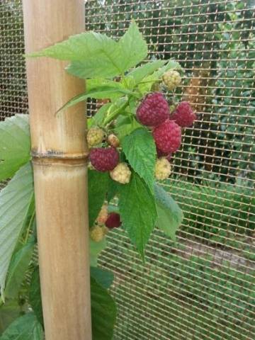 - Las ramitas y los brotes laterales de las frambuesas se rompen con menos frecuencia incluso con fuertes vientos y aguaceros, no cuelgan de la abundancia de bayas.