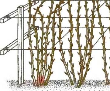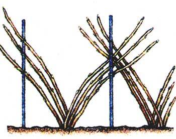 El trabajo se complica por el hecho de que tienes que trabajar con cada par de arbustos. Entre ellos, debes colocar una estaca de al menos dos metros de altura. Los brotes en el arbusto se dividen en dos partes y se atan a su vez a cada clavija. El resultado del proceso es claramente visible en la imagen de arriba.