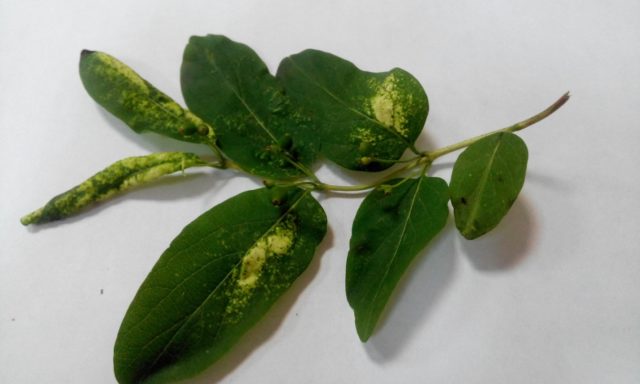 El moteado de las hojas de madreselva es causado por nematodos del suelo. La coloración natural de la corona cambia, aparecen rayas y manchas de color blanco amarillento en las placas de las hojas.