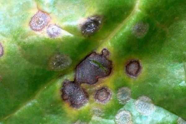 Las manchas rojo oliva se acompañan de la aparición de manchas rojo amarillentas en las hojas, que adquieren gradualmente un tinte marrón.