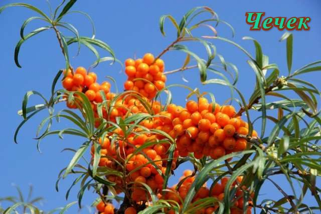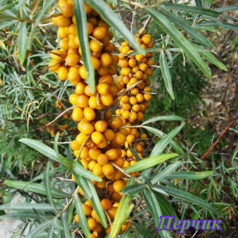 Novia | Fin de verano - principios de otoño | Aproximadamente 8 | Ligeramente extendido | Ausente | Grande (0,8-1 g), sabor agridulce, naranja intenso | Resistencia a las heladas, la sequía, los cambios de temperatura. Susceptibilidad a la endomicosis. Dañado por la mosca del espino amarillo |