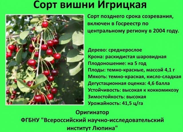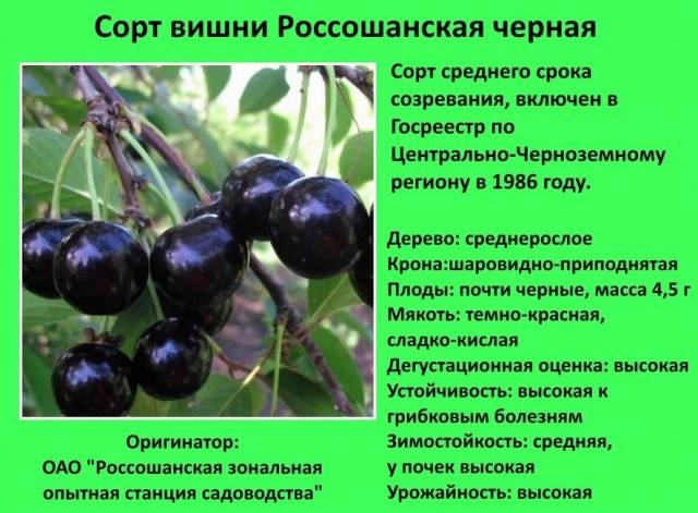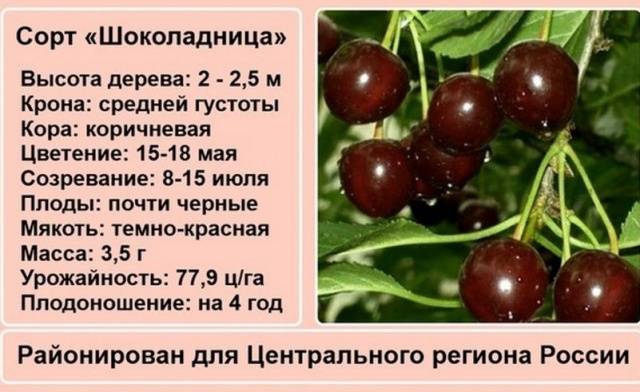 Antracita | Mediados de Julio | Hasta 18 kg por árbol | Promedio | Resistencia al invierno - buena, resistencia a la sequía - mediocre | Parcialmente autofértil | Noche, Vladimirskaya, Shubinka, Chica de chocolate, Lyubskaya |