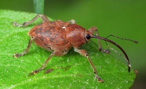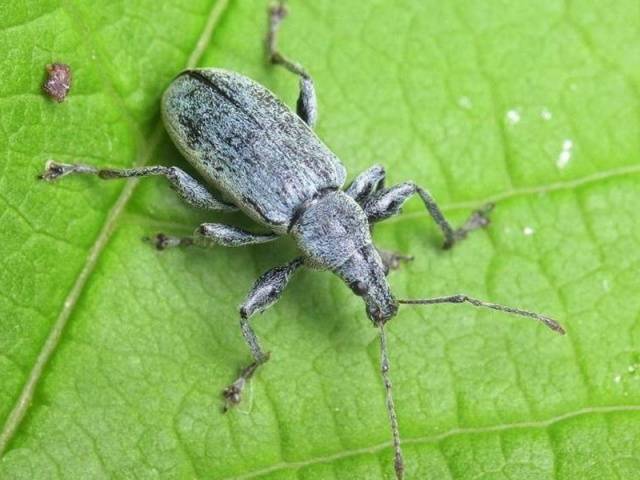 La plaga es un pequeño escarabajo gris-negro de hasta 3 mm de largo con una probóscide. En primavera, las hembras dañan las yemas de las moras al poner huevos en ellas. Y en julio, los escarabajos jóvenes que emergen de las larvas se alimentan activamente de hojas de mora, antes de irse a pasar el invierno en el suelo.