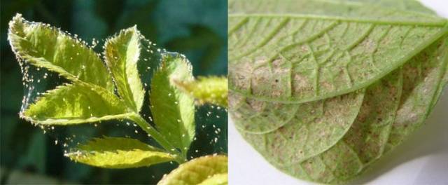 Las garrapatas son pequeñas arañas y no se pueden distinguir a simple vista. Su presencia delata la aparición de manchas blanquecinas y moteadas en las hojas de mora. Viven en la parte inferior de las hojas y, a veces, se delatan formando una pequeña telaraña entre las hojas y los tallos. Sobre todo, son perjudiciales para las plántulas jóvenes y los brotes de mora. Las hojas se vuelven amarillas rápidamente, se secan y se caen. Los arbustos adultos sufren garrapatas con mucha menos frecuencia. La plaga se reproduce especialmente intensamente en condiciones cálidas y secas, por lo que se encuentra con mayor frecuencia en invernaderos y en las regiones del sur.