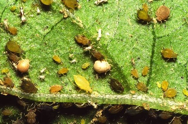 Esta es solo una de las variedades de la numerosa familia de los pulgones, que se distingue por su tamaño relativamente mayor y su color verdoso amarillento con adornos oscuros en el cuerpo. De lo contrario, el estilo de vida y el grado de nocividad son muy similares al pulgón de la hoja de la frambuesa, por lo tanto, los métodos de control de plagas son los mismos.