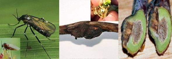 Las moras son dañadas por las larvas de este pequeño insecto volador, de color amarillo anaranjado. La plaga es fácil de identificar por la presencia de engrosamientos en los brotes, en forma de crecimientos: agallas. Es en ellos donde viven y se alimentan las larvas del mosquito de la agalla del tallo. Allí también pasan el invierno. Las pupas aparecen en la primavera, y cuando el clima es cálido (+ 10 ° + 13 ° C), aparecen mosquitos adultos de las agallas. El brote generalmente se rompe en los lugares donde se concentran las larvas y el número total de brotes dañados puede alcanzar el 40-50%.