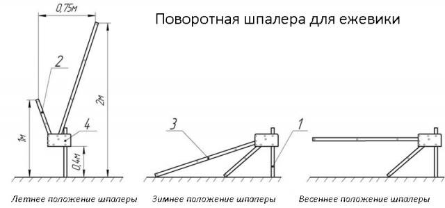 La esencia de la tecnología radica en el hecho de que ya en -23sobreCon las moras, los brotes de frutas se congelan. En las regiones frías, las variedades rastreras se colocan fácilmente en el suelo, cubiertas con esteras de paja hasta la primavera. Una variedad de mora semicurada no se puede doblar hasta el suelo. Los troncos y brotes lignificados se rompen cuando se retiran del enrejado. Es muy difícil doblar los látigos. El enrejado giratorio le permite colocar la planta en el suelo sin quitar las pestañas del cable. El diseño simplemente se transfiere a la posición de invierno aflojando la tensión de las líneas y girando la bisagra. Dos personas pueden realizar un sencillo proceso de colocación, incluso en una gran plantación.