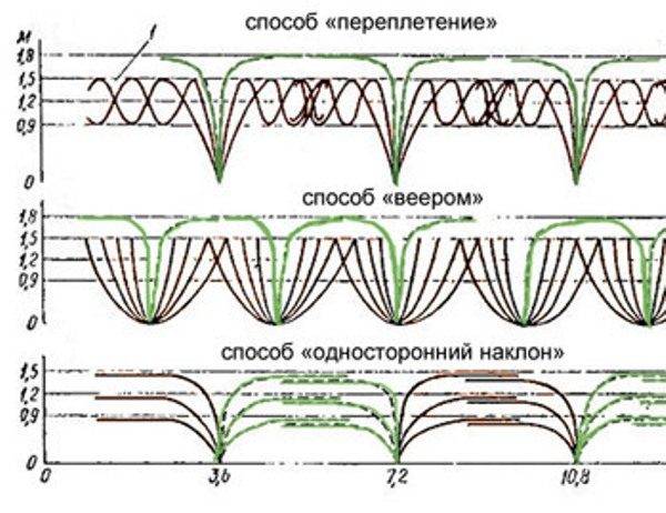 - Entrelazado. El azote de la planta se fija al enrejado en tres niveles. Las nuevas ramas que han crecido se separan del tronco, llevándolas a la cuarta línea superior.