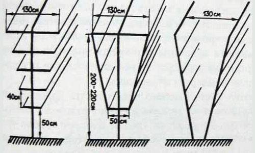 La estructura consta de los mismos pilares con alambre, solo los soportes están dispuestos en dos filas. El enrejado simplifica la liga de las pestañas, la formación de la planta, los arbustos no se espesan. Los agricultores con grandes plantaciones demandan modelos de dos carriles. Por diseño, los enrejados son de tres tipos, hechos en forma de letras: "T", "V", "Y".