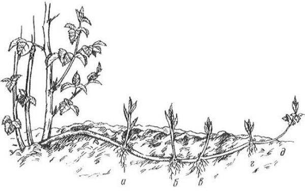 Un arbusto adulto se excava desde diferentes lados. Después de la separación de los esquejes de raíz, los hoyos se entierran. En primavera, los trozos de raíces se colocan en el suelo, se cubren con tierra fértil suelta de hasta 3 cm de espesor, se riegan. Después de la germinación, las plántulas jóvenes se plantan en un lugar permanente.