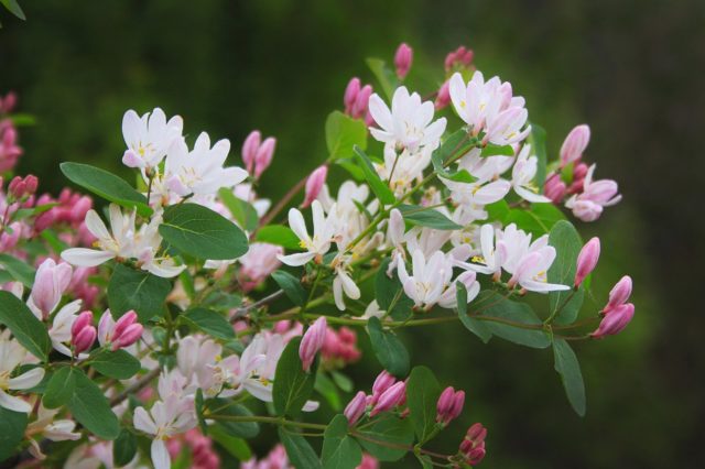 - Las flores son rosadas, dispuestas en pares o individualmente en las axilas de las hojas de la madreselva.