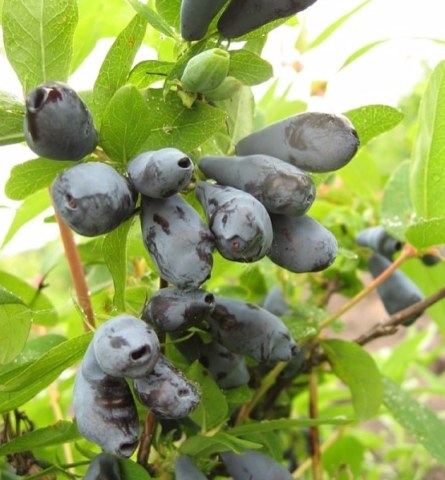 - Wiliga. Variedad medio temprana de madreselva, las bayas maduran a finales de junio. El arbusto es compacto, comprimido, mientras que su altura puede alcanzar los 1,8 m. Los brotes son potentes, rectos, no pubescentes. Las bayas son de color azul oscuro con una flor cerosa azulada, alargadas de forma ovalada, en forma de maza, con un peso de hasta 1,2 g. El rendimiento de 1 arbusto puede alcanzar hasta 2,5 kg. La tasa de desmoronamiento es débil. Sabor a postre, dulce con acidez, sin amargor.