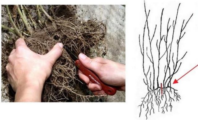 Lo mismo se hace con las capas de raíz de madreselva. Los brotes jóvenes se cortan del arbusto madre junto con parte de la raíz y se plantan en un lugar nuevo.
