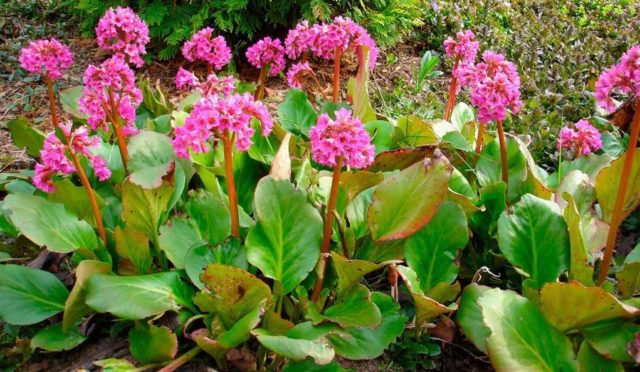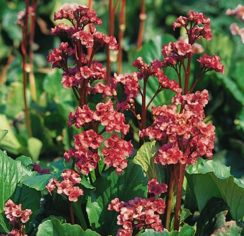 Bergenia Cordifiola Red Beauty es una planta ornamental de floración temprana. Se utilizan activamente en el diseño de paisajes al crear arreglos florales, así como para plantaciones individuales. Va bien con astilbe, azucenas, aquilegia.