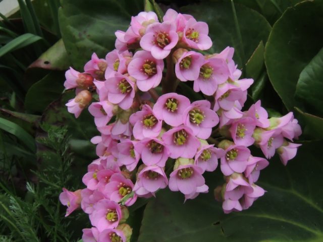 Bergenia cordifiola Lilac Rose debe su nombre al color de sus flores. Altura: de 30 a 45 cm. Antes de la floración, el arbusto es corto y contiene solo un tallo con una gran cantidad de hojas grandes y correosas de color verde oscuro. Para el otoño, se vuelven rojas y permanecen así durante todo el invierno.