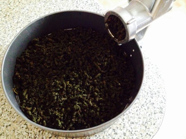 Para el procedimiento, puede utilizar tanto una acción mecánica como un dispositivo eléctrico. Las placas de hoja deben pasarse por una rejilla grande. El té granulado se puede obtener de la masa triturada.