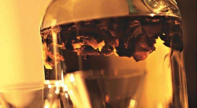 - Vierta con alcohol ilegal y cierre herméticamente, luego deje infundir durante dos semanas en un lugar oscuro a temperatura ambiente.