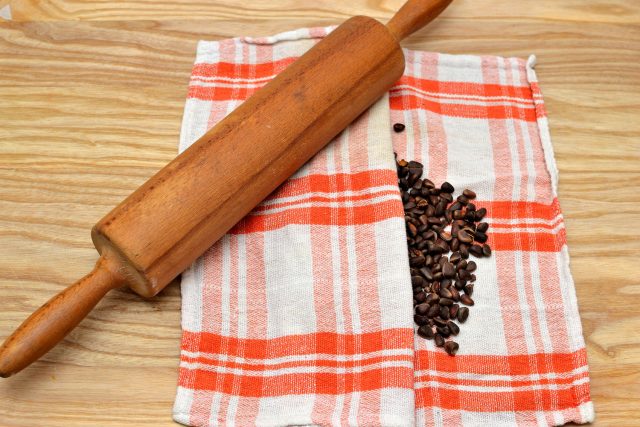 Los piñones secos se pueden colocar en una bolsa de plástico, desinflar y atar firmemente. Luego puedes triturar la cáscara con un rodillo. No debe presionar con fuerza las frutas, ya que la cáscara se vuelve frágil, puede dañar los granos.
