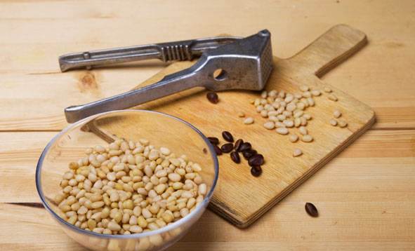 Es mejor verter agua hirviendo sobre las semillas de un cono de cedro y luego secarlas. Después de sujetar cada fruta entre las partes de los alicates, comience a apretar los mangos hasta que crujen. Esto se hace con cuidado y lentamente, ya que es fácil aplastar la nuez por completo.