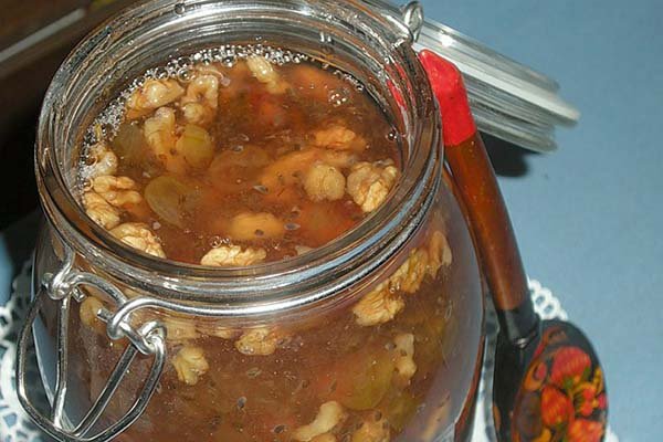 Otra forma de almacenar nueces es cosecharlas para el invierno. Los granos pelados se colocan en un frasco y se vierten con miel fresca en una proporción de 1: 2, respectivamente. Estas infusiones de miel se almacenan en el refrigerador hasta por 12 meses.