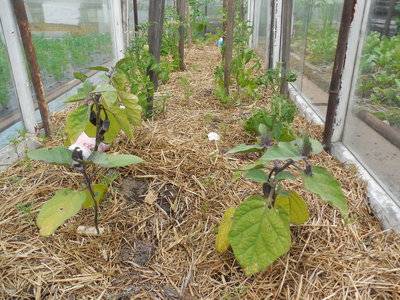 El mantillo es una buena alternativa a la envoltura de plástico, bajo la cual se crea un exceso de humedad y condiciones favorables para el desarrollo de enfermedades fúngicas. Este método de cultivo sin película bajo mantillo inhibe el desarrollo del tizón tardío. Los hongos se desarrollan en la frontera entre el aire y la tierra. El mantillo bloquea su desarrollo. Pero las hojas inferiores de los arbustos de berenjena deben cortarse. Los tallos de berenjena deben ventilarse. No es necesario que espese demasiado la plantación. Cinco plantas por metro cuadrado es el número máximo para una variedad.