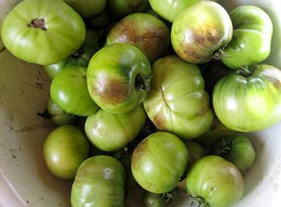 - Los tomates inmaduros pero dañados por el tizón tardío deben retirarse del arbusto y calentarse en agua a una temperatura de 60ºC.0C. Para hacer esto, vierta el líquido caliente en un recipiente o balde y baje los tomates. A medida que se enfría, el agua se cambia a tibia. Después del calentamiento completo, el hongo phytophthora en las frutas muere, lo que significa que pueden colocarse en un lugar oscuro para la maduración, sin temor al desarrollo de la pudrición. Además, los tomates verdes, después de cortar las partes dañadas, se pueden usar para enlatar;