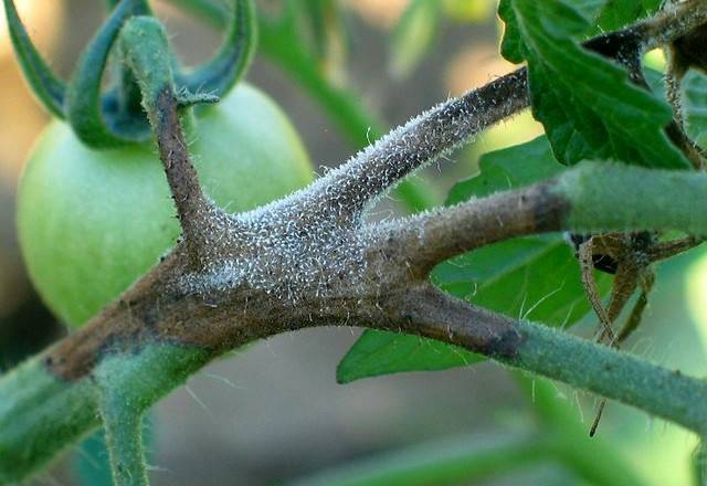 - Aparecen manchas oscuras y luego negras en el tronco principal, brotes de tomate. Las lesiones comienzan a secarse;
