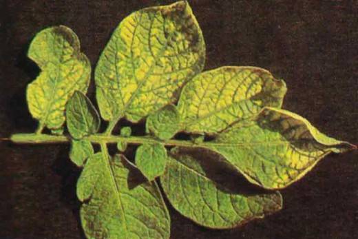 Si las papas se fertilizaron mal con potasio en la primavera, los síntomas a menudo no capturan toda la hoja, sino solo partes de ella. Aparecen en ellos áreas clorosas de un tinte amarillo. La mayoría de las veces, aparecen alrededor de áreas secas en la punta o en el borde de la hoja, entre las nervaduras. Con el tiempo, la papa parece oxidada.