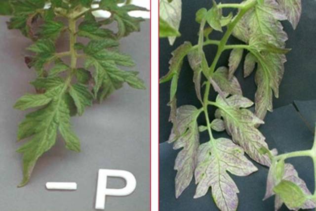 En papas insuficientemente fertilizadas con fósforo, como con escasez de nitrógeno, se observa la formación de brotes delgados y opresión general. Pero las hojas, por el contrario, adquieren un color muy oscuro y con una inanición de fósforo fuerte o prolongada, un tono púrpura. Cuando los tejidos mueren, aparecen manchas oscuras.