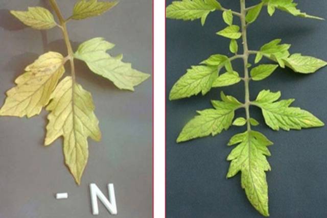 Si no se agregó suficiente nitrógeno debajo de las papas en la primavera, la planta adquiere un color claro inusual y las hojas inferiores se vuelven amarillas. Es cierto que las hojas pueden volverse amarillas con un riego insuficiente, pero luego los tejidos blandos entre las venas se vuelven amarillos primero. La falta de nitrógeno se caracteriza por el hecho de que son las venas las que cambian de color en primer lugar, y los tejidos ubicados entre ellas pueden retener un color verde. Además, la planta se estira con fuerza y deja de crecer.