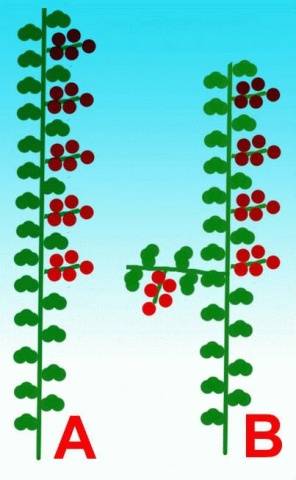 Este método de formación implica la conservación de varios hijastros en el tallo principal de la planta. Después de atar las frutas en los brotes del lado izquierdo, es necesario pellizcarlas. Por lo tanto, el agricultor recibirá un arbusto de tomate alto, que consta de un tallo fructífero principal y varios racimos de frutas en brotes pellizcados (diagrama B).Este método de formar plantas del tipo determinante le permite aumentar el rendimiento del cultivo.
