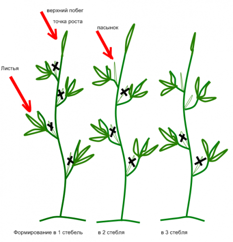 Se recomienda el uso de la formación de dos y tres tallos para tomates determinantes de tamaño mediano que son propensos a la autocompletación del crecimiento. El proceso de formación consiste en eliminar solo algunos de los hijastros. Entonces, al cultivar tomates en el tronco principal, se deben eliminar 2-3 de los hijastros más bajos. Arriba quedan uno o dos de los brotes laterales más fuertes que, junto con el tallo principal, crecerán formando hojas y ovarios. Con este pellizco, puede obtener el máximo rendimiento de los tomates de tipo determinante. Puede ver el esquema de formación en 2 y 3 tallos en la imagen de abajo.