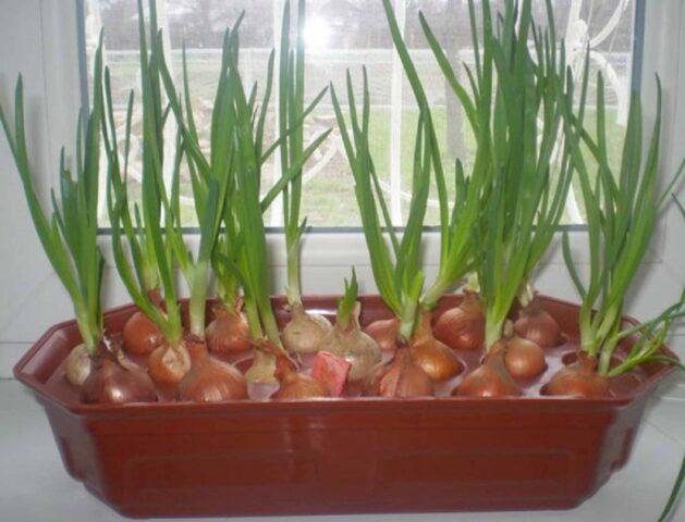 Para forzar cebollas, es adecuado un recipiente de plántulas regular.
