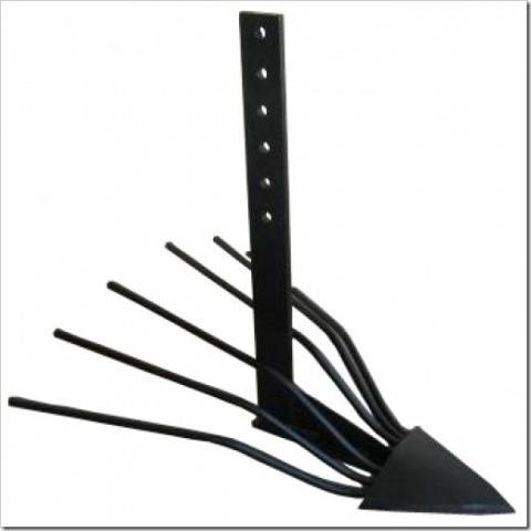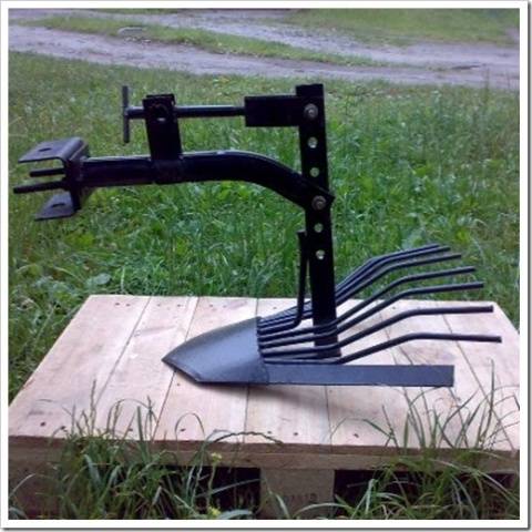 La foto muestra el arado de ventilador más simple. Una nariz puntiaguda corta una capa de tierra y arroja tubérculos sobre ramitas curvas, todo el cultivo permanece en la superficie de la tierra.
