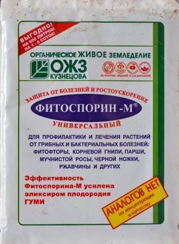 - La fitosporina se usa para el tratamiento de otoño y primavera del sitio de phytophthora. Se añaden 6 ml de la sustancia a 10 litros de agua. Esta solución es suficiente para un cuadrado. El riego se puede repetir durante el crecimiento de la planta.