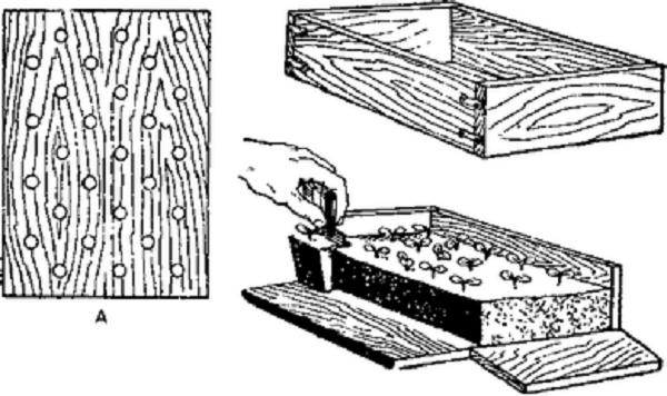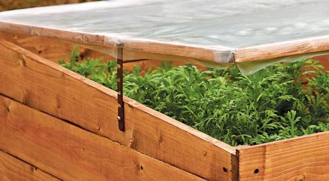 En la primavera, se vierte tierra en la caja, se siembran las semillas, se cubre el marco de la tapa con una película transparente, se cubre la caja y las plántulas esperan que broten las plántulas.