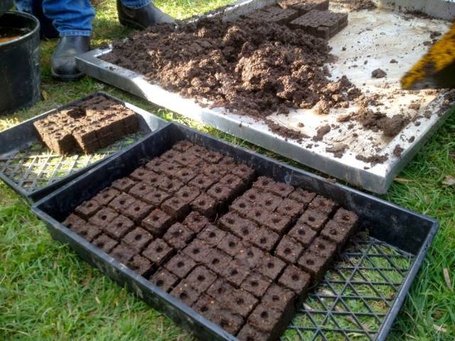 La masa pastosa resultante se extiende en una capa de 5 cm de espesor en cualquier sitio. El secado debe realizarse de forma natural a la sombra. Cuando la losa de turba se fortalece, pero no se seca, se cortan con un cuchillo cuadrados con un tamaño de lado de 5x5 cm. Se hace una depresión de unos 2 cm en el centro de cada cubo. El agujero es necesario para sembrar las semillas. Los cubos de turba terminados se colocan en cajas de plástico con un fondo de celosía. Para recoger agua después del riego, el recipiente se coloca en una bandeja profunda.