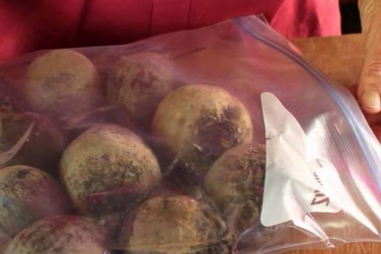 Es posible almacenar remolachas en un sótano o sótano en bolsas de polietileno. Esta es una buena opción para espacios pequeños. Después de todo, una bolsa con cultivos de raíces se cuelga de los clavos, no ocupa espacio en los estantes. Se hacen agujeros en el fondo de la bolsa para drenar el condensado. No se recomienda atar con fuerza, pero de vez en cuando es necesario ventilar la bolsa.
