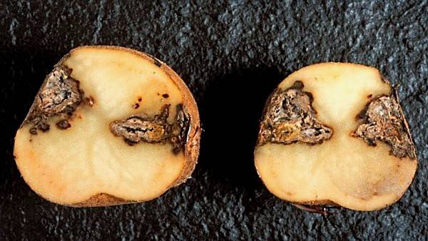 Tratamiento: desinfección de la tierra antes de plantar con Trichoderm, use material de siembra saludable, aflojamiento y aporque, eliminación obligatoria de las puntas antes de la cosecha para evitar la infección de los tubérculos.