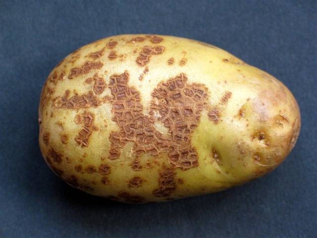 Señales: los tubérculos se ven afectados, aparecen úlceras y crecimientos en ellos, la cáscara se agrieta, formando escamas de color marrón oscuro, en los tallos de la parte superior, las esporas del hongo se combinan en forma de una placa aceitosa gris.