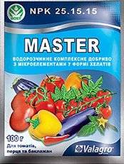 Este complejo fertilizante mineral para tomates contiene una cantidad significativa nitrógeno, potasio y fósforo. El fertilizante es excelente para saturar el suelo con nutrientes. La alimentación compleja hace que las plantas sean resistentes al estrés, acelera su crecimiento y promueve el desarrollo normal y armonioso de las raíces. El fertilizante "Master" se aplica al suelo a razón de 100-150 g por 1 m.2.
