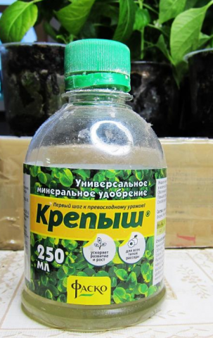 "Krepysh" es un fertilizante mineral complejo especialmente desarrollado para la alimentación de plántulas. Contiene 17% de nitrógeno, 22% de potasio y 8% de fósforo. No contiene absolutamente ningún cloro. Puede usar el aderezo durante la preparación del sustrato de nutrientes agregando gránulos al suelo. También es eficaz utilizar fertilizantes para regar las plántulas de tomate desde la raíz. Puede preparar un aderezo superior agregando 2 cucharadas pequeñas de la sustancia a un balde de agua. Cuando use fertilizante "Krepysh" en forma líquida, agregue 100 ml de aderezo en un balde de agua.