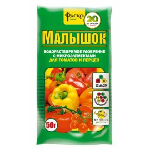 El fertilizante Malyshok para tomates y pimientos es producido por Fasco. Se disuelve bien en agua y se usa en diferentes etapas de desarrollo: