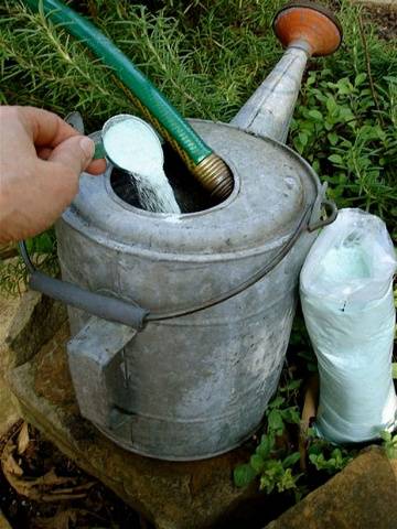 Agregue una cucharada grande de fertilizante a un balde de agua de 10 litros.
