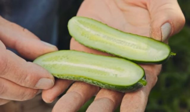 Las frutas tienen buen sabor, además, la fruta se clasifica como ensalada. El color de esta variedad es verde oscuro. La superficie del pepino es irregular y pubescente. Según la descripción, el pepino Shosha tiene una piel fina, en la que el sabor amargo está completamente ausente. El color de la pulpa es verde claro. El pepino es alargado, de unos 10 cm de largo y 3 cm de diámetro. El peso aproximado de la fruta es de 50 gramos. Las semillas son pequeñas y tiernas.