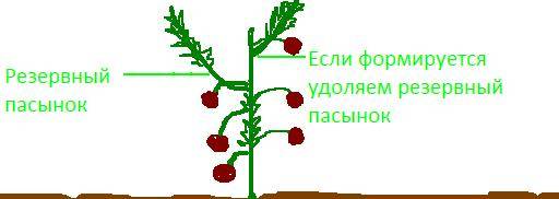 - Un tallo. Una cantidad suficiente de cepillos dará una cosecha significativa. Para estar seguro, siempre deje un hijastro de respaldo debajo de la maleza recién formada para protegerse contra los bordes prematuros. Si el arbusto crece de manera segura y forma el siguiente cepillo, entonces el hijastro de respaldo ya estará debajo de él, y el que quedó antes debe eliminarse pellizcándolo en 2 hojas.