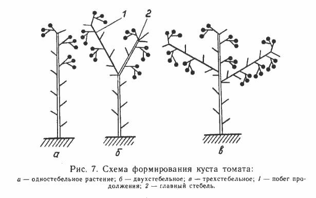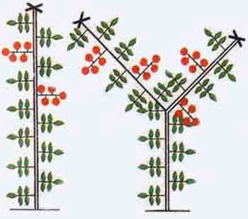 El esquema de la formación de tomates cherry en uno, dos y tres tallos.