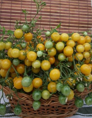 Indet medio-temprano con frutos amarillos muy dulces en forma de pera. La cantidad de frutos en un racimo es de hasta 25. Hoja de papa. Forma muchos hijastros. Forme 2 tallos.