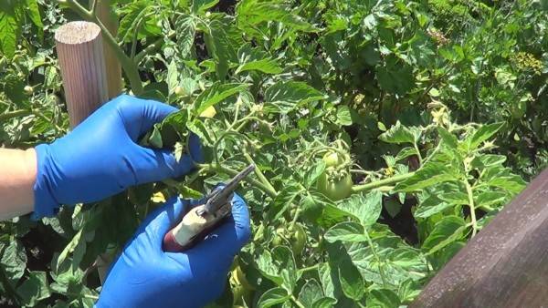 - Al retirar hijastros y hojas de plantas con las manos, se debe tener cuidado de no dañar la delicada piel del tronco del tomate. Para hacer esto, se recomienda que los brotes laterales no se doblen hacia abajo, sino hacia un lado durante la extracción. Las hojas se quitan inclinándose o cortándose con un cuchillo.