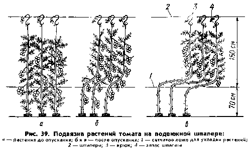 Cuando la altura de las plantas indeterminadas alcanza el techo del refugio, puede usar una atadura vertical o doblar las plantas boca abajo. Este método de atado es ideal para arbustos que se forman de acuerdo con el principio clásico de un tallo. El enrejado móvil permite, al bajar parcialmente los troncos, proporcionar espacio adicional para el crecimiento de arbustos. Puede ver un ejemplo de este método de tomates altos como liga en un invernadero en la imagen: